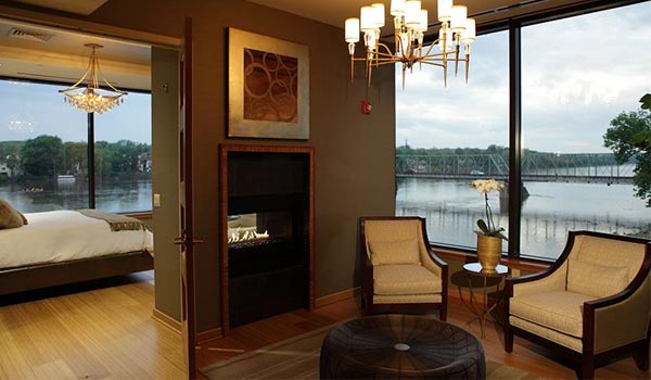 Truly indulge in our large, two room corner suite featuring stunning river views, a bar and entertainment area, double fireplace, marble bath with rain shower and soaking tub and a king bed. Enjoy free Wi-Fi and complimentary lite Continental Breakfast.